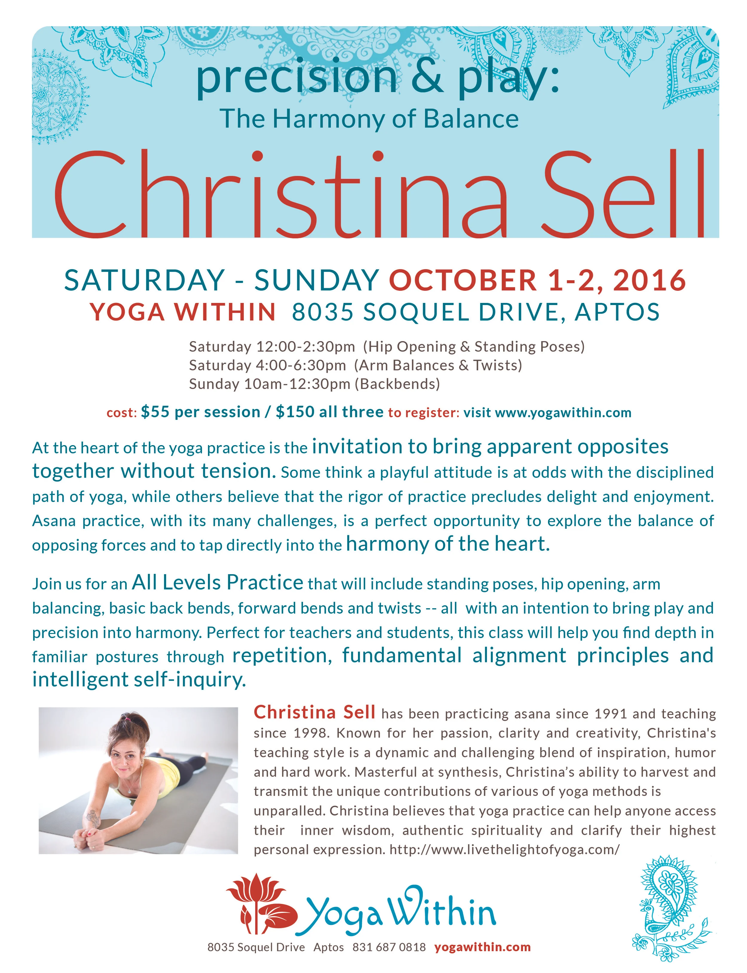 I highly recommend that you attend this wonderful workshop in Aptos with Christina Sell. Christina's clear instruction and precise cuing has made an amazing impact on my practice and has strongly influenced my teaching in the last 4+ years.